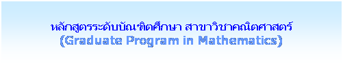 ภาควิชาคณิตศาสตร์ หลักสูตรระดับบัณฑิตศึกษา สาขาวิชาคณิตศาสตร์ ภาควิชาคณิตศาสตร์ คณะวิทยาศาสตร์ จุฬาลงกรณ์มหาวิทยาลัย โทร. 02-218-5140, 02-218-5172 Fax.02-255-2287 ปรับปรุงครั้งล่าสุด : 26 July 2011 13:13:53 |