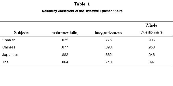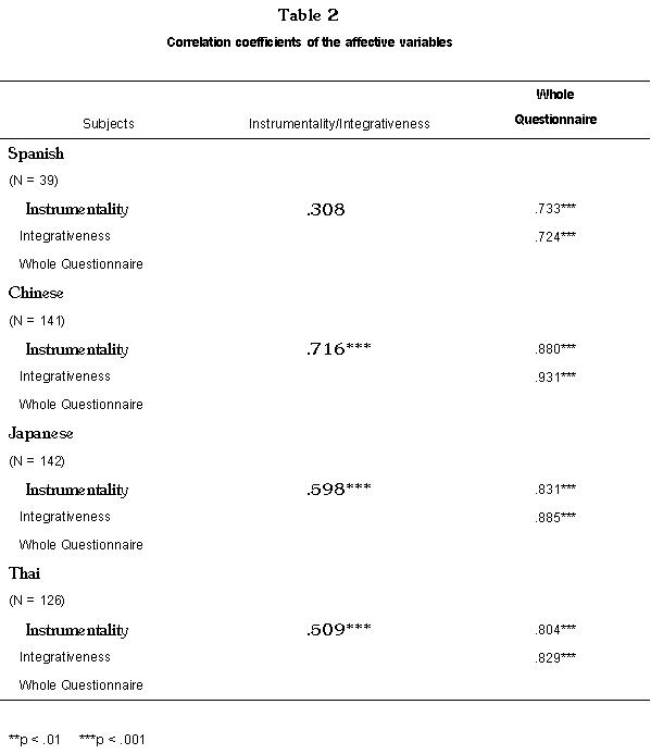 The reliability coefficients range from .713 to .9533 which indicates an acceptable level of consistency. The coefficients for Instrumentality, Integrativeness, and the whole questionnaire for the Spanish speaking subjects were .872, .775, and .906; .877, .890, and .953 for Chinese; .882, .882 and .948 for Japanese; and .864, .713, and .897 for the Thai subjects. To answer the first research question, “whether the distinction between instrumentality and integrativeness exists when the repeated-measurement technique questionnaire is used”, the SPSSX Pearson correlation subprogram was employed. Table 2 illustrates the correlation coefficients of the affective variables.