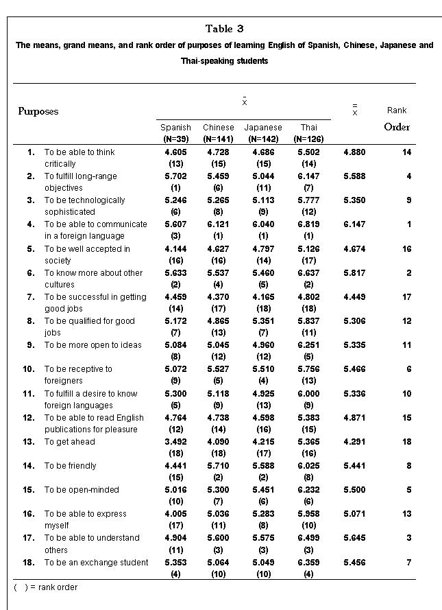 In addition, the fact that the Chinese, Japanese, and Thai students did not separate the two categories provides further evidence to support the problem of construct validity of affective variables. As Oller (1973:8) noted: “The very term affective variables which implies that there are many and that they are countable discrete variables may be somewhat misleading.” Therefore, emotions should not be treated as countable discrete variables. Rather than trying to identify affective variables, teachers should try to motivate students to learn and encourage a favorable language learning environment, no matter where it takes place, in either an ESL or EFL context. And that’s why the second research question, “why do students from different geographical, linguistic and cultural backgrounds learn English?” was further investigated. Table 3 gives the means, grand means and rank order of various reasons for studying English given by the Spanish speaking students as well as the Chinese, Japanese, and Thai students.