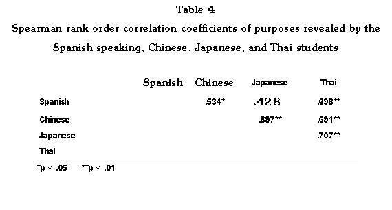 The above results were obtained from the grand means of all purposes. To find out whether the rank orders of the ratings of the four groups are significantly different or not, Spearman rank order correlation coefficients were computed. Table 4 presents the results.